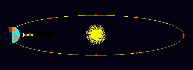 -Durante su viaje alrededor del Sol la Tierra describe una elipse llamada órbita. El cambio de las estaciones a lo largo del año se produce al darse la particularidad de que el eje de rotación de la Tierra se encuentra inclinado respecto del plano de la órbita. Nuestro planeta pasa por cuatro momentos